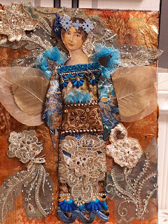 I want you to meet Grace - She was produced in an Angel and Icon workshop that was taught by Gwen LaFleur at Dar's Studio. She has a board base- Her dress is made with some luscious brocade- She is surrounded by filigreed lace and netting. In the background are gossamer leaves- Her face reminded me of my beloved Grandmother, Grace.